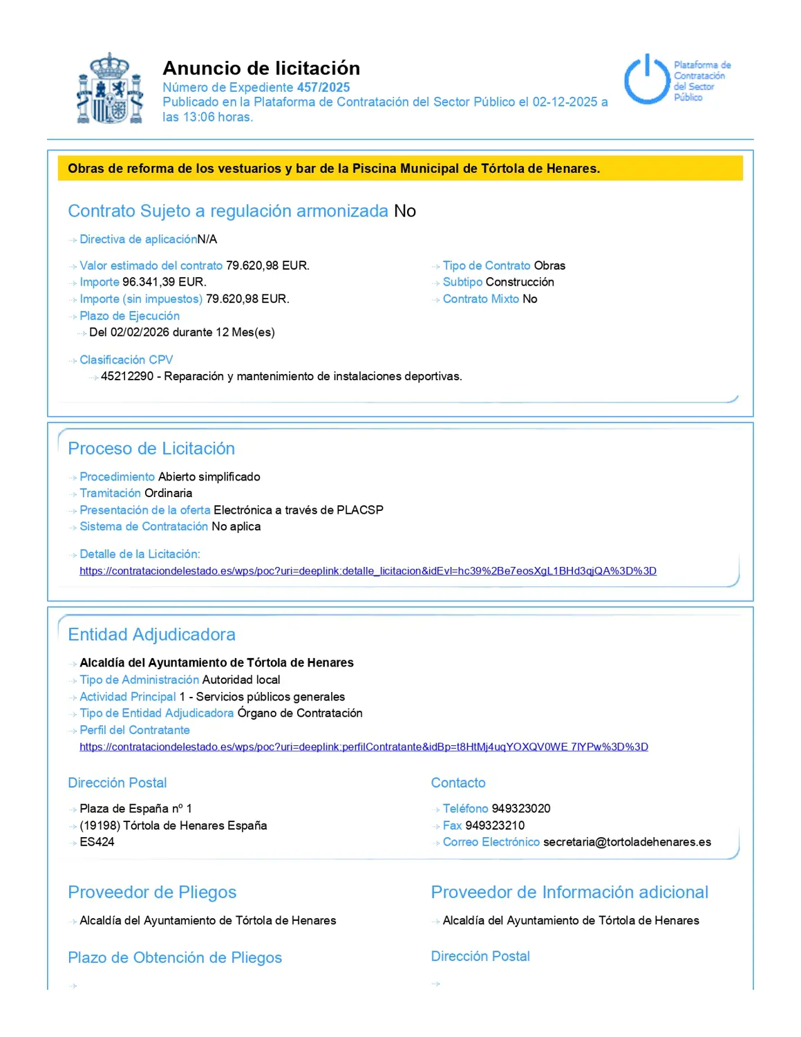 Anuncio de Licitación en la Plataforma de Contratación del Estado, obras reforma de los vestuarios y bar de la piscina