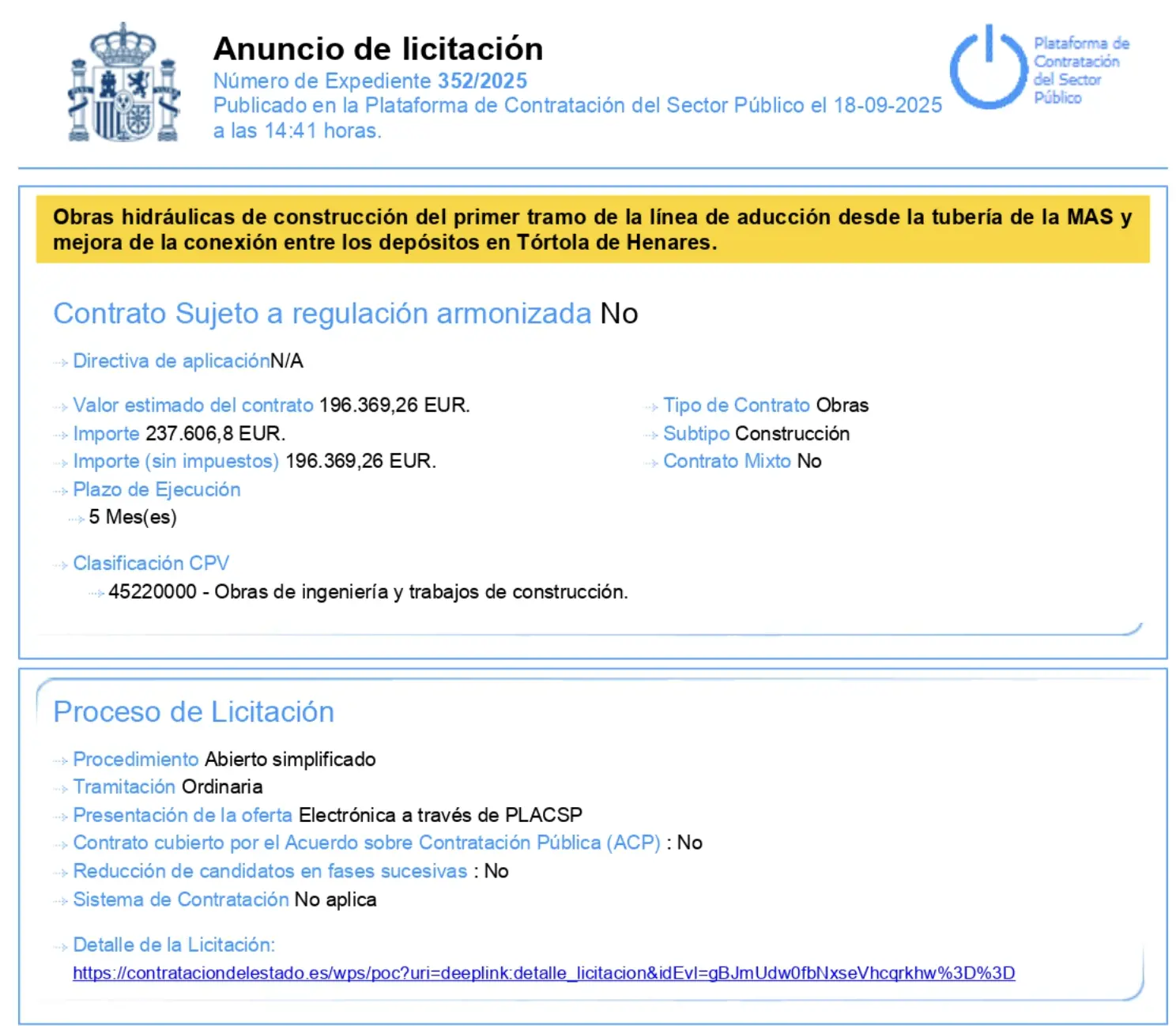 Anuncio de Licitación en la Plataforma de Contratación del Estado, para las obras hidráulicas de construcción del primer