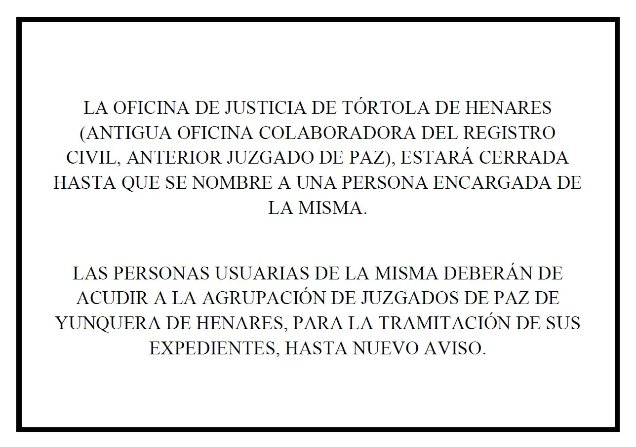 La oficina de justicia de Tórtola de Henares (antigua oficina colaboradora del Registro Civil, anterior juzgado de paz), estará cerrada hasta que se nombre a una persona encargada de la misma.