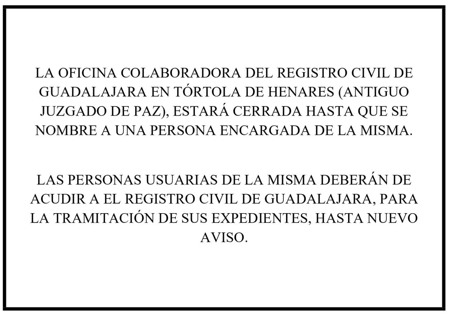 Cierre de la oficina colaboradora del Registro Civil de Guadalajara en Tórtola de Henares