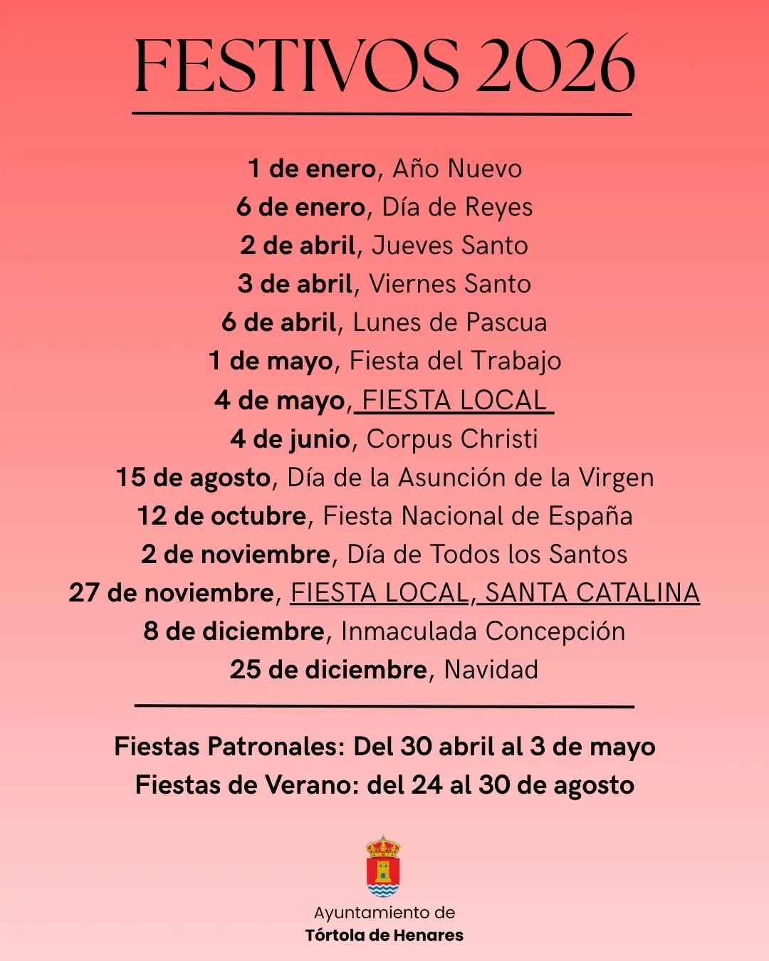 Junto a días como el Día del Trabajador (1 de mayo) o la Fiesta Nacional de España (12 de octubre), el calendario reserva fechas específicas para el disfrute de las tradiciones de Tórtola de Henares. La publicación anticipada de este listado facilitará la organización de eventos, el cierre comercial en días señalados y la planificación de vacaciones por parte de las familias.